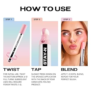- How To Use: Twist the bottom of the tube to dispense the creamy blush through the sponge tip. Apply a small amount directly onto your cheeks. Blend gently using the sponge, a brush, or your fingers with tapping motions. Gradually build up the blush for the desired intensity. Once the formula has set, enjoy long-lasting wear of your blush!